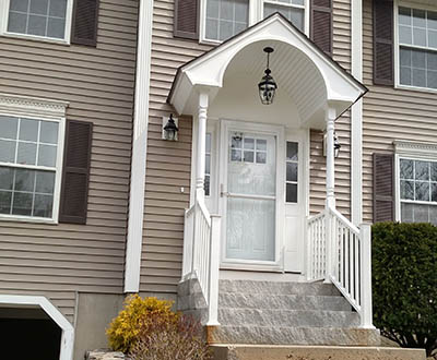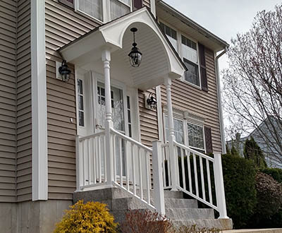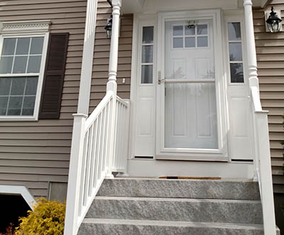 This project was located in Merrimack NH. Our team replaced the front entry door with a Therma Thru Classic Mahogany vinyl door frame and side lights. Replaced the existing storm door with a new full glass storm door. Replaced the old wood columns, handrails and stair rails. Re-worked all the existing wood trim with all new vinyl through the upper roof entry!!